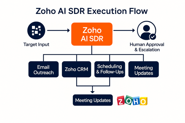 The Zoho AI SDR (Sales Development Representative) is a task‑specific Revenue AI agent designed to execute sales development work directly inside Zoho CRM, email, and calendars. It is not a chatbot and not a demo. It is a governed execution agent built to handle the operational work that prevents sales teams from focusing on selling.